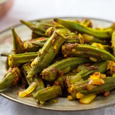 Ladyfingers cooked with onion and spices.